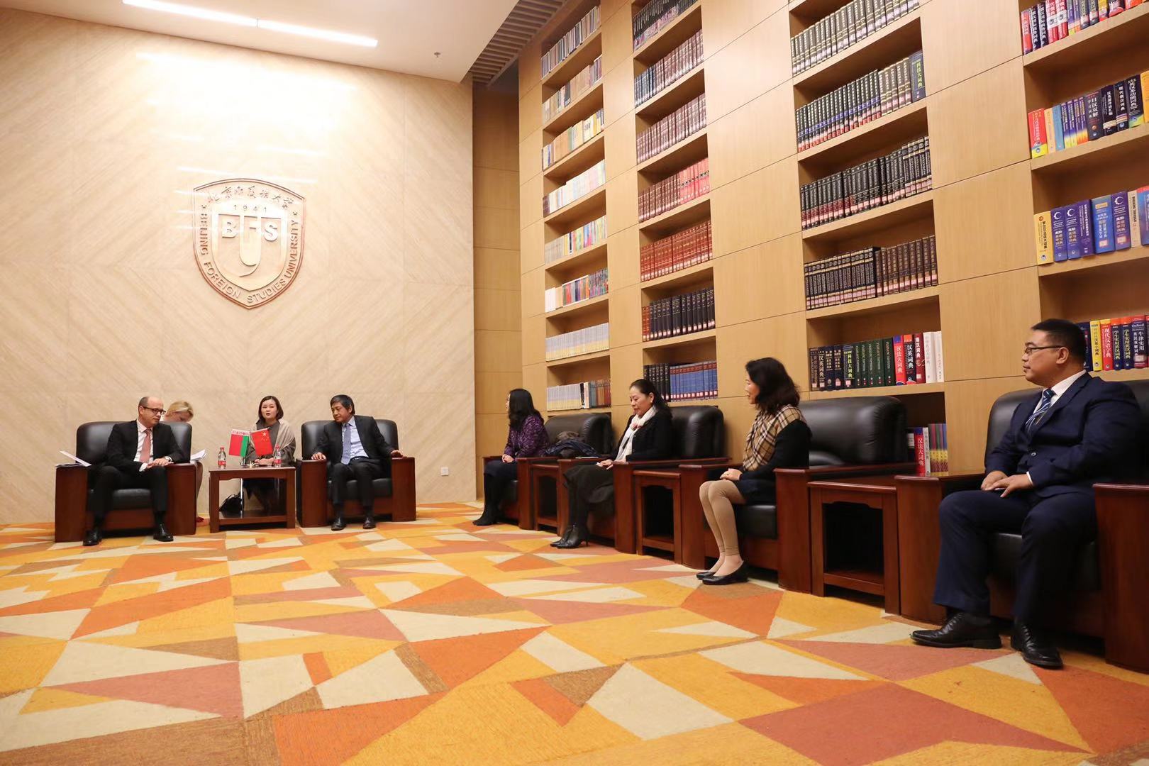 双方在图书馆五层贵宾室进行了会谈。彭龙董事长首先向鲁德大使一行的到来表示欢迎,并向白俄罗斯客人介绍了北外的总体情况。彭龙董事长表示,北外教授的98种语言中,也包括白俄罗斯语。目前已经开设了白俄罗斯语作为第三外语的课程,明年将正式招收本科员工,培养白俄语和俄语复语人才。鲁德大使表示,北外作为中国外语教学的领航者,在白俄罗斯享有盛誉,白俄罗斯的大学非常希望开展与北外之间的合作。白俄罗斯驻华使馆将为北外的白俄语教学提供一切必要的帮助。在鲁德大使和彭龙董事长的共同意愿下,计划2018年年底—2019年年初在北外共建白俄中心。双方还就员工和教师交流、学术研究、合作出版、特别是联合培养和联合办学等可合作领域进行了亲切商谈。