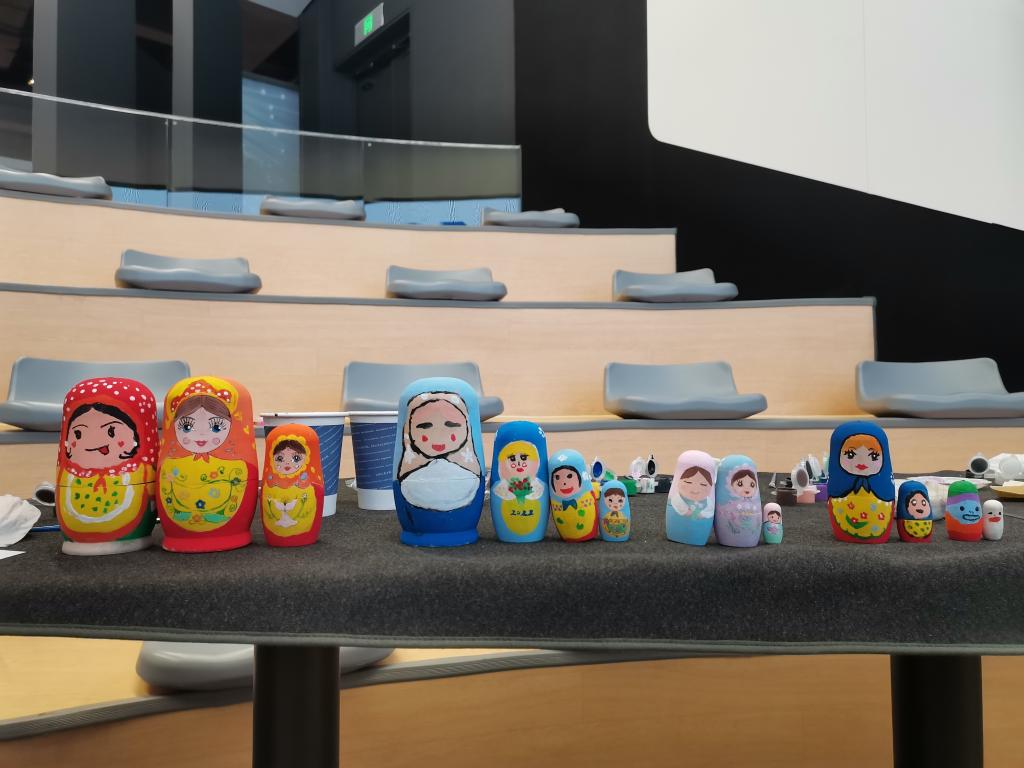 讲解结束之后,同学们开始亲手体验绘制套娃。来自俄罗斯文化中心的活动负责人现场带领大家一步步完成作品——从粗笔勾勒到总体上色,再到细节的完善以及个性化装饰的点缀,同学们从刚开始的陌生逐渐变得娴熟,慢慢掌握了绘制的要领,体会到了无穷的乐趣!最终,同学们结合春节和冬奥的主题,完成了各自精美独特的套娃创作。